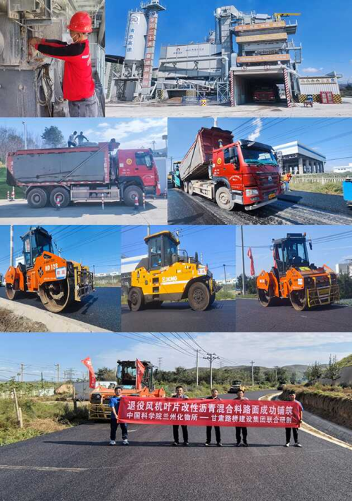 以该技术为基础,兰州化物所和甘肃路桥建设集团合作近期在兰州市清傅路(G312线)开展了退役风机叶片改性沥青混合料示范应用试验段路面的铺设。经检测,退役风机叶片改性沥青混合料路面与常规沥青路面性能无差异,表明将退役风机叶片应用于改性沥青混合料完全可行。