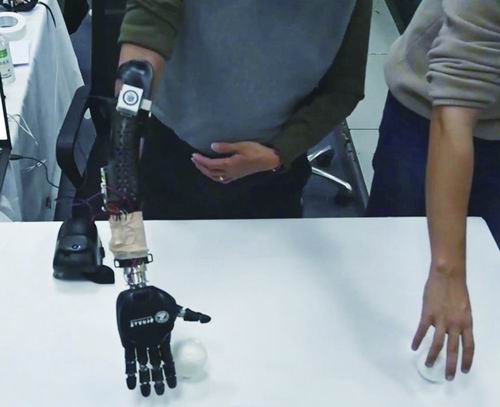 一件是一只不足1千克、“长”着五根灵巧手指的假肢手。它能通过采集分析佩戴者的肌电信号,实现佩戴者对假肢手的自主控制,比如做出握拳、放松、伸展、抓取小球等动作,还能比出“OK”(好的)手势。