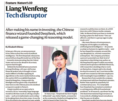 《自然》介绍称,2025年是科学家拓展知识边界的一年,也是颠覆的一年。中国企业家梁文锋1月推出的DeepSeek惊艳了日新月异的AI界,这个大语言模型的表现媲美现有最先进模型,但构建资源仅需后者的一小部分,与此同时,DeepSeek以“开放权重”(直接发布模型训练后的参数权重而无需重新训练)的形式公开,意味着它能免费下载并扩展,为科研人士带来福音。