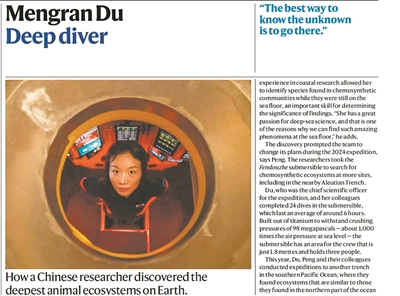 杜梦然则开启了一场科学的冒险,她和团队乘坐潜水器潜入海面下9000多米,首次窥见了一个充满奇异生物的生态系统。