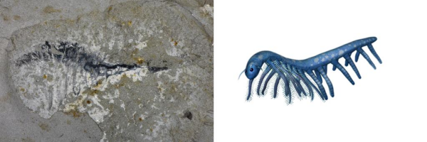 花垣生物群节肢动物-苏鲁斯虾化石图(左)和复原图。新华社发