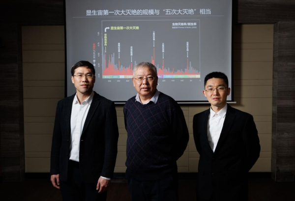 1月22日,在中国科学院南京地质古生物研究所实验室,团队部分成员:中国科学院院士、研究员朱茂炎(中),研究员赵方臣(左),副研究员曾晗(右)合影留念。新华社记者 金立旺 摄