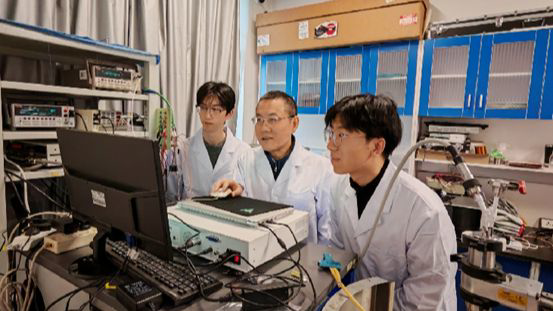 靳常青(中)和团队成员开展超导体的高压表征实验。采访对象提供
