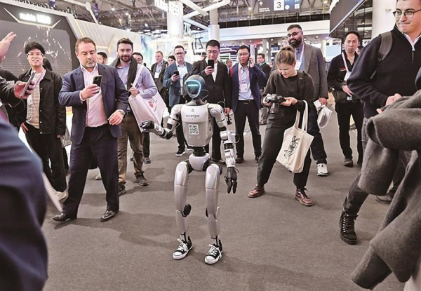 2026年世界移动通信大会上,人们正在围观行走的人形机器人。新华社发