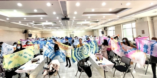大家仔细聆听了老师对扎染历史起源,技巧和手法的讲解。在老师的带领下,大家将围巾扎起来,然后把染料颜色滴在围巾上,在染料的浸润下,围巾的颜色慢慢开始变化。经过等待,再小心翼翼打开自己的围巾,只见层层颜色晕染如同花朵般显现出独特的花纹,一条条独一无二的手工艺品就这样诞生了。通过简单的手工就可以制作出精美的扎染围巾,既有特色又有自己动手的满足感。大家在扎染的技法中体味中华民族传统文化的韵味,共同分享动手扎染的体会和收获的喜悦,现场气氛热烈融洽。
