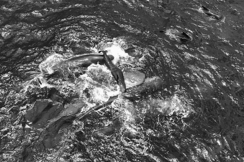 不久后,一头幼鲸的尾鳍开始从母鲸体内露出来。在接下来半小时的分娩过程中,其他雌鲸相互配合,组成了一个高度同步的队形,保护母鲸和新生幼鲸。