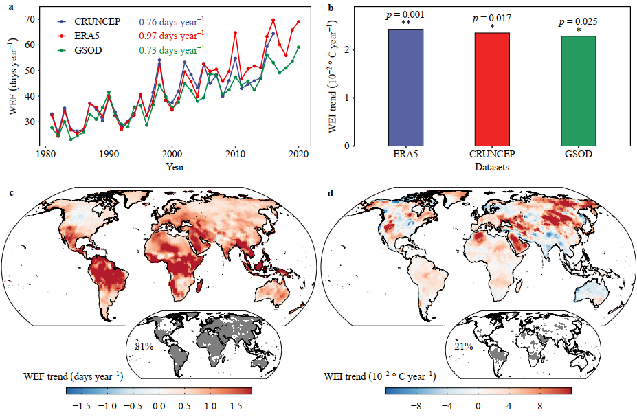 相关研究成果以Weakening of global terrestrial carbon sequestration capacity under increasing intensity of warm extremes为题,发表在《自然-生态与进化》(Nature Ecology & Evolution)上。研究工作得到国家自然科学基金的支持。
