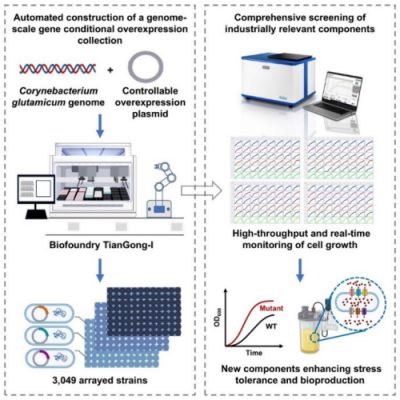 近日,中国科学院天津工业生物技术研究所实现了谷氨酸棒杆菌全基因组规模单基因过表达库的自动化构建与高通量筛选,鉴定了多个影响渗透压耐受性和氨基酸产量的新型功能元件。该研究利用天津工生所生物铸造厂,构建了覆盖谷氨酸棒杆菌全基因组99.7%的单基因过表达库,并建立了资源共享网站。同时,该研究通过全自动、实时生长曲线测定建立了新型功能元件的高通量筛选方法;通过全文库筛选获得了15个可提高渗透压耐受和L-赖氨酸产量的新元件,如新型转录调控因子和DNA修复蛋白,并揭示了渗透压耐受新机制。进一步,研究对近400个膜转运蛋白子库进行筛选,获得了在谷氨酸棒杆菌和大肠杆菌中高效、特异的新型L-苏氨酸外排蛋白。研究将新型外排蛋白应用于L-苏氨酸生产菌株改造,实现了目前最高水平的谷氨酸棒杆菌L-苏氨酸生产。