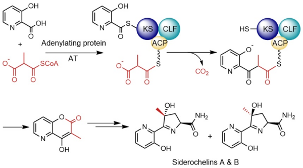 11月6日,中国科学院上海有机化学研究所刘文课题组在《自然-合成》(Nature Synthesis)上,在线发表了题为Analysis of siderochelin biosynthesis reveals that a type II polyketide synthase catalyses diketide formation的研究论文。该研究报道了以甲基丙二酰辅酶A为羧基底物催化二酮单元形成的新型II型聚酮合酶(PKS),打破了对于II型PKSs延伸单元单一性的认知,丰富了科学家对天然产物和生物学共进化的认知,为聚酮类化合物结构多样性的发展与应用奠定了基础。