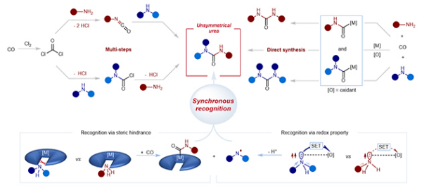 当前,工业上脲类化合物合成主要采用光气法。连接在同一羰基位点的含氮片段不同,需要利用光气法分步将胺组装到羰基上。通过涉及CO与氯气反应生成剧毒光气,利用一种胺与光气发生反应,生成所需的异氰酸酯中间体/酰氯,而异氰酸酯/酰氯与另一种胺后续反应生成非对称脲衍生物,且反应中生成大量腐蚀性盐酸。催化的方法使胺氧化羰基化过程成为生产脲的直接路线,但采用两种胺作为底物,在反应性上较难区分,且对称脲与非对称脲同时生成,使得选择性难以调控。