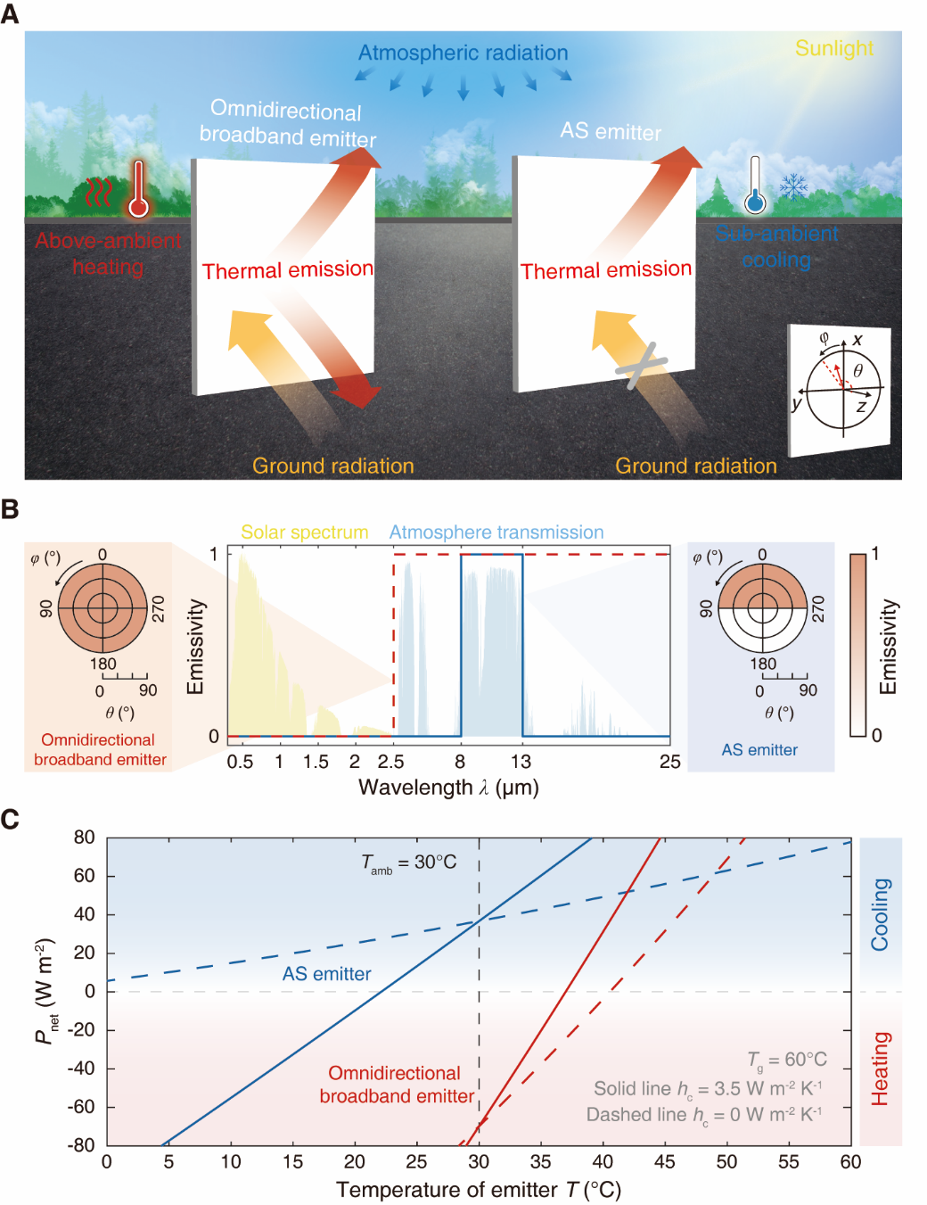 该研究从太阳反射率、大气透明窗口内的光谱选择性、热辐射角度非对称特性协同设计,以热力学、互易性、波导和声子激化共振等理论为基础,利用跨尺度对称破缺结构实现了热辐射在空间角度上的非对称分布以及在光谱上的选择性调控。
