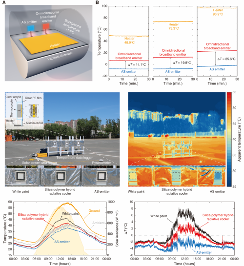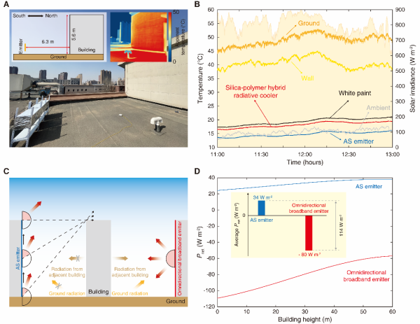 中国科学院长春光学精密机械与物理研究所研究员李炜团队与合作者,利用热光子学手段,实现了热辐射角度和光谱的跨波段协同调控,设计出具有跨尺度对称破缺性、角度非对称光谱选择性的定向发射器件——AS发射器件,实现了竖直表面的日间亚环境辐射制冷。相关研究成果以Subambient daytime radiative cooling of vertical surfaces为题,发表在《科学》(Science)上。