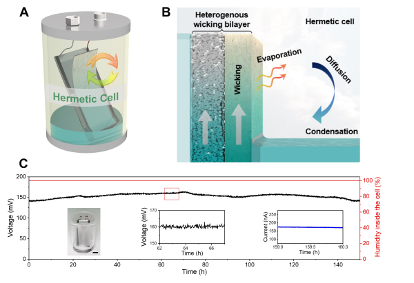 异质浸润结构设计实现密闭环境中水的自发、定向、持续流动与蒸发,并以此为基础制备水伏电池