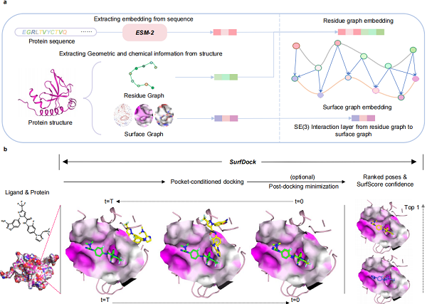 近日,中国科学院上海药物研究所郑明月团队开发出基于生成式AI的蛋白-配体复合物结构预测方法SurfDock。这一方法利用蛋白质表面信息构建几何扩散神经网络,高精度自动生成配体结合构象,并应用于基于结构的虚拟筛选。相关研究成果以SurfDock is a surface-informed diffusion generative model for reliable and accurate protein–ligand complex prediction为题,在线发表在《自然-方法》(Nature Methods)上。