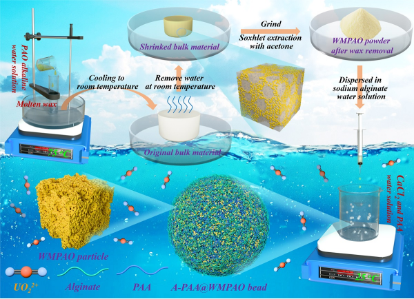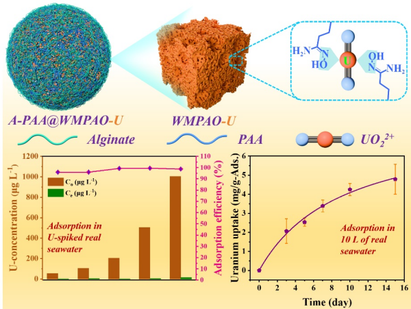 近日,中国科学院大连化学物理研究所研究员陈吉平团队在海水提铀研究方面取得进展。该团队利用精心设计的蜡铸造法和“相转换”过程,制备了具有大孔结构的聚偕胺肟(WMPAO)水凝胶粒子,并将WMPAO包覆进海藻酸-聚丙烯酸(A-PAA)球中,制备了A-PAA@WMPAO复合球材料。该复合球材料可用于海水中铀酰离子的富集分离。