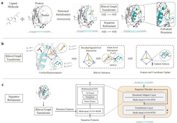 (a)利用PocketGen进行蛋白质序列-结构共同设计;(b)双层图Transformer编码器;(c)蛋白质预训练语言模型用于序列预测及高效微调技术