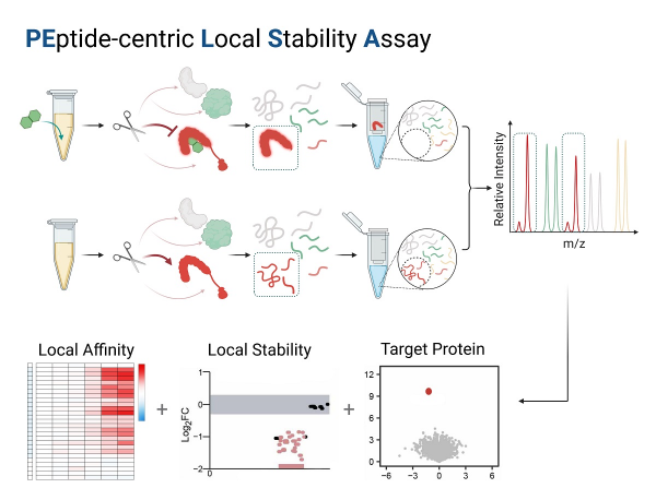 研究发现,采用大量的胰蛋白酶对自然状态下的蛋白质进行酶切,使之直接产生适合质谱检测的肽段,能够对配体结合引起的局部稳定性变化产生放大作用。基于这一发现,研究开发了以肽段为中心的蛋白质局部稳定性探测方法,用于配体靶蛋白质鉴定。PELSA无需对配体进行化学修饰、不依赖亲和力大小,直接能够在细胞裂解液等复杂样品中发现与配体结合发生局部稳定性变化的蛋白质,从而实现配体结合蛋白质、结合位点以及局部亲和力的系统解析。这一方法广谱适用于代谢物、药物、污染物等不同结构配体的靶蛋白质分析。
