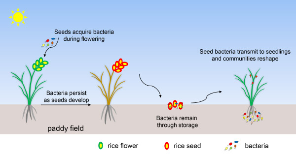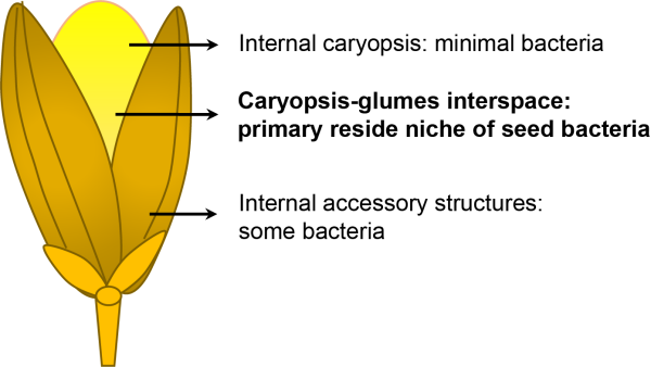 研究发现,水稻种子具有丰富的内生菌群。这些微生物主要定殖于颖果(遗传学意义上的种子)和种子附属结构之间,而颖果本身保持基本无菌的状态。种子菌群主要在开花期从环境中获得,灌浆期和黄熟期则不具备获得外源菌群的能力。研究显示,菌群一旦获得,可在种子发育和贮存期间维持稳定数量,能够随种子萌发迁移至新生植株的叶片和根系,并根据不同组织特征进行群落重构。