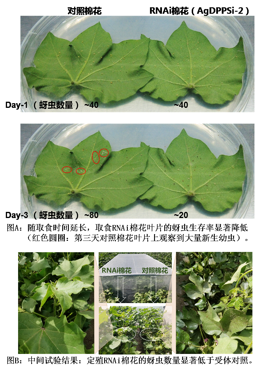 实验室取食实验显示,与受体对照相比,取食RNAi棉花叶片的蚜虫的AgDPPS1基因表达量受到抑制;随取食时间延长,取食RNAi棉花叶片的蚜虫生存率显著降低。新疆农垦科学院生物技术研究所试验基地中间试验统计结果表明,定殖RNAi棉花叶片的蚜虫数量显著低于受体对照。科研人员收集田间蚜虫,进行Northern blot检测。结果显示,定殖RNAi棉花的蚜虫的AgDPPS1基因mRNA被降解,证实RNAi棉花通过抑制蚜虫AgDPPS1基因表达获得对蚜虫的抗性。