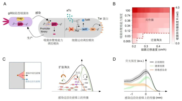 (A)细菌运动行为和噬菌体繁殖能力可定量调控的菌株设计原理图、(B)不同迁移速度和噬菌体繁殖能力下的菌株“迁徙淘汰”相变图、(C)“迁徙淘汰”的空间分选机制、(D)实验验证