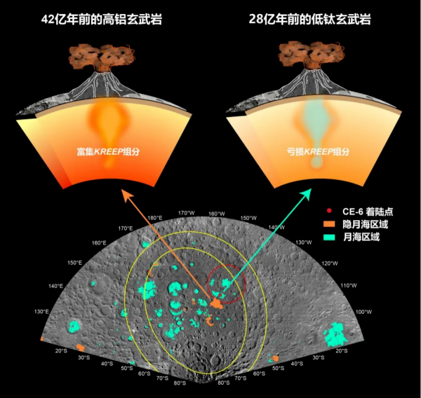 嫦娥六号返回月壤样品中记录的两期玄武质火山活动及其月幔源区性质示意图