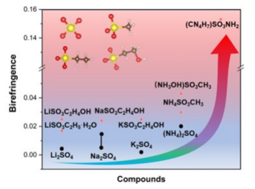 硫酸盐具有宽的光学带隙、短的紫外截止边,成为光学晶体领域的重要研究对象。硫酸盐基元近乎正四面体结构具有高的对称性,使其极化率各向异性较小,对晶体的双折射几乎没有贡献,阻碍了它们在光学材料领域的应用。受带隙和双折射平衡关系制约,亟待解决在保证宽带隙的情况下提高材料双折射问题。