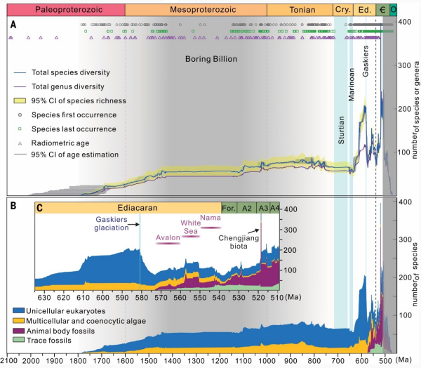 针对上述难解之谜,联合团队在长期对早期生命化石及其产出地层开展研究的基础上,创建了目前全球数据最全、信息量最大的早期地球古生物地层数据库,创新性地结合超算和人工智能等大数据分析手段,首次绘制出地球距今20亿至5亿年前元古宙至寒武纪早期的真核生物多样性曲线。数据库覆盖单细胞真核生物化石、多细胞或多核体藻类化石、动物实体化石与遗迹化石等类型,收录了2731种化石的12820条首现记录与末现记录以及相关地层的数据。研究定量展示了跨度长达15亿年的高精度复杂生命早期演化历史,揭示了地球上复杂生命是如何经历元古宙中期漫长的早期演化历程以及新元古代的多次大辐射和大灭绝事件后,最终为“寒武纪大爆发”期间现代类型的复杂生态系统的建立铺平道路。这一成果填补了早期地球真核生物多样性宏演化的空白,为剖析地球复杂生命起源和早期演化规律,探索地外生命是否存在以及宜居地球的可持续发展奠定了理论基础并提供了借鉴。