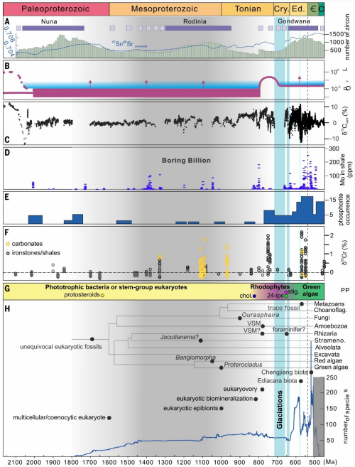 复杂生物出现是生命演化史上重要的革新事件,意味着地球生物圈从以微生物为主的世界转入以动、植物大规模发育为特征的宏体复杂生命世界。距今25亿至5.39亿年的元古宙见证了单细胞真核生物起源、简单多细胞化以及复杂多细胞生物初步辐射的演化历程。长期以来,关于上述演化历程的认知,缺乏大数据层面的定量研究。
