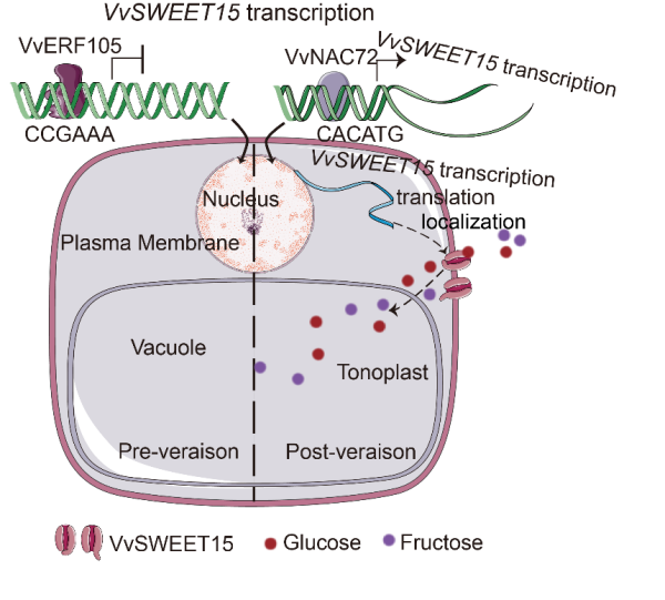 中国科学院植物研究所团队以葡萄为研究对象,探究了糖转运蛋白VvSWEET15功能及其转录调控机制,揭示了转录因子VvERF105和VvNAC72在浆果成熟过程中如何协同调控VvSWEET15的时空表达。研究表明,VvSWEET15在转色阶段高度表达,促进己糖在浆果中的快速积累。VvERF105作为抑制因子,在转色前结合启动子上的LTR核心元件,抑制VvSWEET15的表达,从而限制己糖积累;而VvNAC72则在转色后通过结合启动子中的CACATG元件激活VvSWEET15的表达,加速糖分积累。这种转录激活与抑制的动态平衡精确调控了葡萄果实的糖代谢,为高糖积累提供了保障。