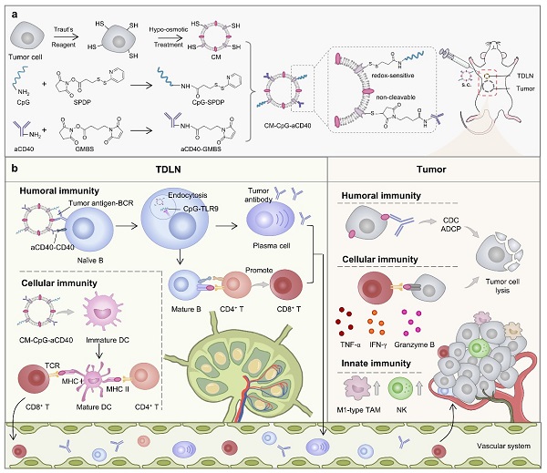 针对上述问题,该研究通过在肿瘤细胞膜囊泡上使用小分子交联剂偶联两种免疫增强剂即激动性CD40抗体(aCD40)和CpG,制备靶向B细胞的个性化多表位肿瘤纳米疫苗CM-CpG-aCD40。该疫苗可主动靶向并蓄积在外周免疫器官,通过肿瘤细胞膜上的抗原与B细胞受体的结合、aCD40与CD40的结合以及CpG与Toll样受体9的结合,为B细胞提供多重活化信号,促进B细胞的抗体分泌和抗原呈递能力。同时,该疫苗能够促进树突状细胞熟化,激活CD8+ T细胞,重编程肿瘤相关巨噬细胞至M1表型。研究发现,在三阴性乳腺癌小鼠模型中,这一疫苗肿瘤生长抑制率达89.3%。