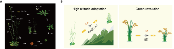 多维组学的比较分析发现,西藏生态型基因组含有更多的重复序列和基因丢失,而群体遗传分析表明,西藏拟南芥有效群体大小在全球拟南芥群体中最小且具有典型孑遗群体的特征。研究利用全生育期的表型比较分析发现,在15个性状中,有10个性状在两种生态型间有显著差异。进一步,研究聚焦10个有显著差异的性状,基于F2群体与亲本的比较进行选择分析,发现角果密度受自然选择。研究发现,角果密度差异受赤霉素合成途径中的GA20ox1基因调控。GA20ox1的功能缺失变异在全球多个地区的高海拔适应中起到重要作用,说明GA20ox1的平行进化促进拟南芥的高海拔适应。