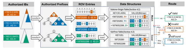 针对BGP路由验证的性能挑战,该团队通过深入建模分析提出现有方案的性能瓶颈源自底层的块验证模型,提出从根本上突破性能瓶颈的新型授权前缀验证模型,并基于这一模型设计了基于树比特位图的高效路由起源验证算法h2ROV。h2ROV能够提升验证速度并有效降低存储开销。算法实验结果显示,相比于业界最优算法,h2ROV在IPv4场景下验证速度提高了1.4倍,内存开销减少了69.9%。系统验证结果表明,h2ROV对于路由消息处理流程的影响减少10.4%~61.4%,对于BGP全网收敛时间的影响降低2.2%~16.3%。相关成果被USENIX NSDI 2025录用。