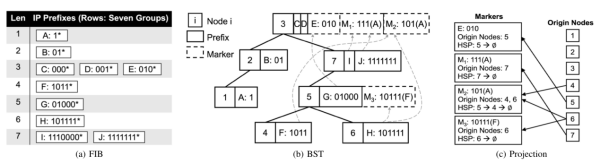 针对IPv6路由查找的性能挑战,该团队联合华为算法专家通过分析不同网络场景下IPv6规则的分布特点,提出基于启发式二分搜索的高性能IPv6路由查找的方法HBS,并在此基础上提出树旋转机制可针对IPv6前缀分布特点动态调整树形,实现不同网络场景下的自适应高性能路由查找。实验效果表明,相比经典算法SBS、Tree Bitmap以及最新方法SAIL、Poptrie,HBS的查找性能最高可提升17.5倍、15.5倍、26.6倍和30.2倍。相关成果被IEEE/ACM Transactions on Networking录用。