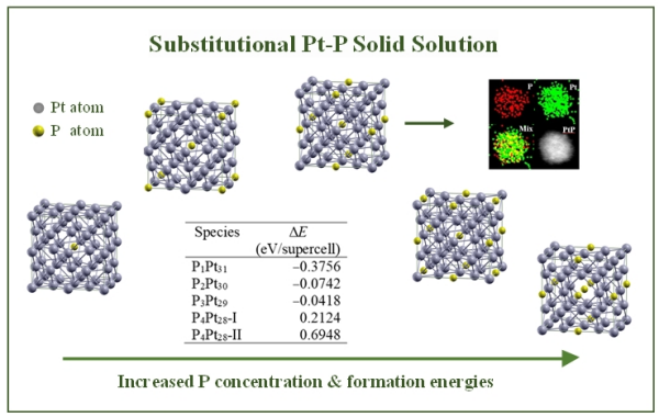该研究在十八烯和油胺混合溶剂中制备出虫子状Pt纳米颗粒,随后在高温下用TOP将其磷化。研究通过透射电子显微镜观察发现,磷化反应能够引起颗粒形貌的极大变化;磷化后的颗粒由虫子状变成直径约为4.8 nm完全球形的置换式固溶体,且该固溶体可由多种表征手段协同证实。理论计算表明,如果磷化后的固溶体能够维持稳定的面心立方结构,则P的掺杂上限约为10%。这与实验观察吻合,符合原子尺寸差异预示的有限固溶体。