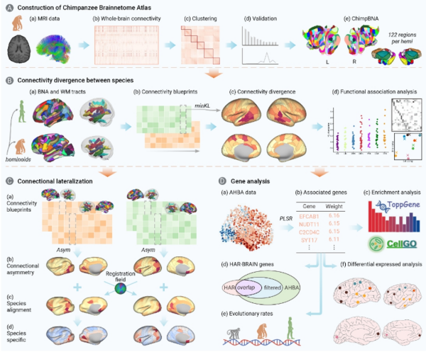 针对上述难题,该研究基于此前提出的利用脑连接信息绘制脑图谱的基本思想,绘制出黑猩猩脑网络组图谱。利用这一图谱,研究重建了同源白质纤维束,为人类和黑猩猩构建了连接指纹图,并为在亚区级别进行细粒度的跨物种脑连接差异分析以及识别相关的白质束提供了可能。进一步,研究检查了每个物种脑连接模式的广泛侧化,并将这些模式与物种间连接性差异的关系对齐到一个共同的空间中,识别了与物种间连接性差异相关的基因及其表达模式。