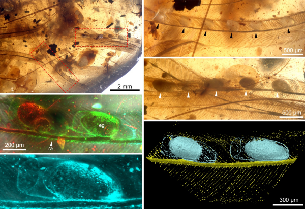 该研究在大量缅甸琥珀收藏中发现了一件罕见的包含羽虱卵的羽毛标本。这枚琥珀中保存了散落的廓羽标本。其中,两根纤细的羽枝的轴上分别紧密附着一排规则排列的卵。每颗卵的长度约为512微米,间隔约526微米至748微米,基部通过粘性物质附着在羽枝轴上。卵呈细长形,顶部无覆盖结构,形态特征与现代鸟类羽虱卵相似,但在粘附面积和排列方式上表现出明显差异。