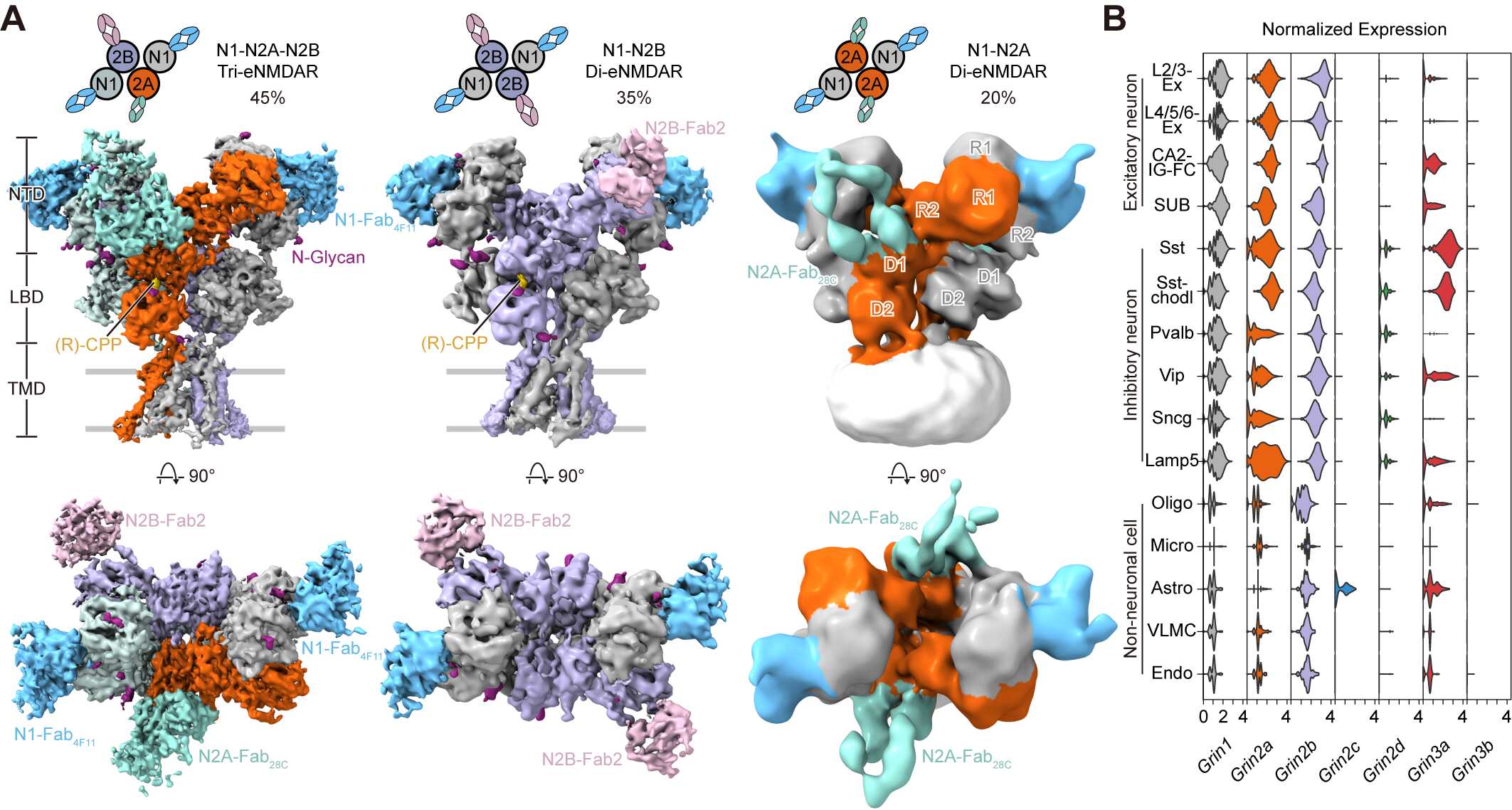 该研究利用冷冻电镜技术,在皮层和海马中的内源NMDA受体解析出三种主要的受体亚型——GluN1-N2A-N2B三异四聚体、GluN1-N2B二异四聚体和GluN1-N2A二异四聚体,分别占45%、35%、20%的比例。研究发现了GluN1-N2A-N2B三异四聚体是内源丰度最高的亚型,强调了GluN2A和GluN2B亚基在生理状态同一受体中的功能整合。这更新了领域内三十年来认为发育关键期是从GluN1-2B转变为GluN1-2A的观点,应修正为从出生时GluN1-2B转变为成年的GluN1-2A-2B、GluN1-2B和GluN1-2A三种亚型共存的论点。