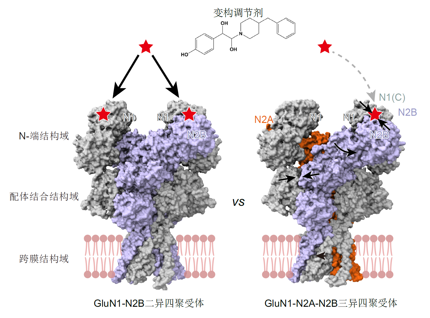 进一步,该研究通过结构对比发现了GluN2B亚基在GluN1-N2A-N2B三异四聚体和GluN1-N2B二异四聚体中的构象区别,揭示了同一亚基在不同受体中存在构象差异,以及这一差异决定不同亚型的生物物理学、药理学和通道开放属性。不同内源NMDA受体间的构象差异,为探讨内源NMDA受体的功能多样性以及不同受体的药理差异奠定了分子基础。这为设计具有亚基特异性且具有亚型偏好性的化合物提供了可能,有助于提高NMDA受体药物的靶向性。