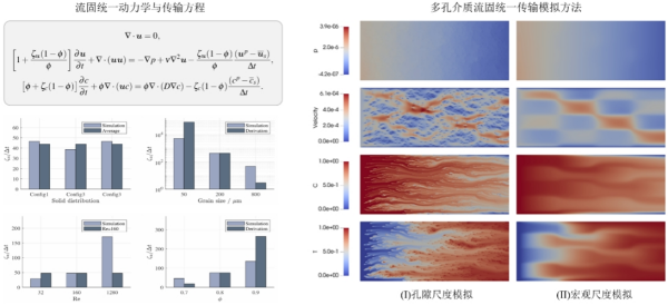 该研究发展了多孔介质流动-传输-化学反应界面尺度/宏观尺度高可信度模拟方法以及孔隙尺度多相流模拟方法等。同时,为满足大规模工程问题研究需要,该研究提出了针对多孔介质非均匀结构的尺度升级模拟方法。相比于孔隙尺度模拟,这一方法加速了10万倍以上,预测误差低于8%。