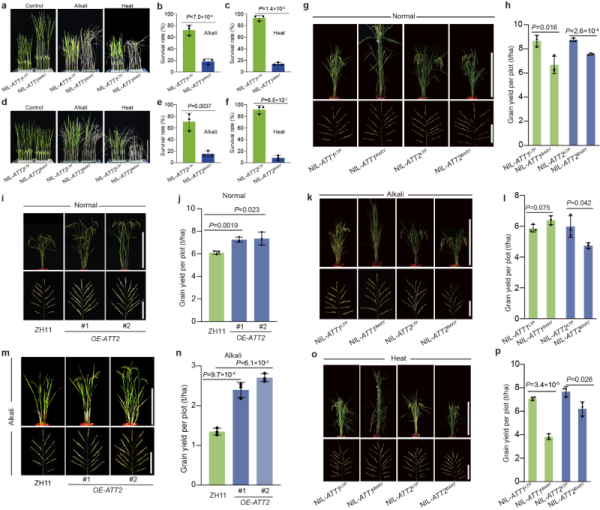 该研究分离克隆了水稻碱-热抗性新基因ATT1/2,阐明了它们调控耐盐碱、耐热性的新机制,为突破半矮秆“绿色革命”主栽品种的抗逆性与产量互相拮抗的瓶颈提出了新的解决方案。这是合作团队继挖掘出耐热TT3分子遗传模块后,在作物抵抗非生物胁迫研究领域取得的又一项重要进展。
