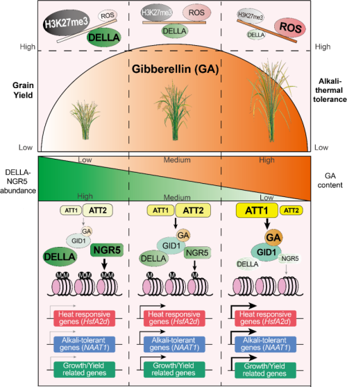 该研究对3万多株水稻遗传材料进行大规模交换个体筛选和耐碱、耐热表型鉴定,定位克隆到两个耐碱-热的QTLs基因ATT1和ATT2。ATT1/Sd1和ATT2/GNP1作为一对同源基因,编码GA20氧化酶,参与控制活性赤霉素合成。进一步,分子机理研究发现,高浓度活性赤霉素会减少SLR1蛋白积累,降低过氧化物酶活性和活性氧清除酶基因表达量,在碱、热胁迫下,引起活性氧(ROS)过量积累,使水稻表现出对碱-热胁迫敏感的表型;低浓度活性赤霉素会增加SLR1蛋白积累,并与NGR5互作,通过NGR5-LC2介导的组蛋白甲基化(H3K27me3),抑制耐盐碱胁迫和耐热胁迫基因的表达,同样地,水稻表现出对碱-热胁迫敏感的表型。在中等浓度活性赤霉素水平下,SLR1蛋白处于中等含量,平衡ROS与H3K27me3甲基化水平,使得水稻表现出强碱-热胁迫抗性。研究发现,ATT2功能比ATT1弱,更适合通过生物工程的方法来实现精准调控赤霉素,以提高半矮秆“绿色革命”水稻品种的抗逆性和产量。
