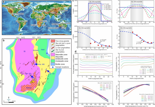 (a)全球典型伟晶岩型锂矿床分布图,(b)甲基卡矿区地质简图,(c)甲基卡矿床308号脉围岩剖面锂含量和锂同位素剖面,(d)热模拟和扩散模拟结果