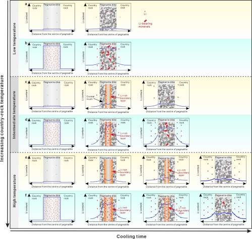 针对上述问题,中国科学院广州地球化学研究所研究员王强团队联合研究员王核等,在对川西甲基卡伟晶岩型锂矿床天然样品分析的基础上,结合热模拟和扩散模拟发现,伟晶岩脉的锂含量取决于初始熔体的锂含量并受控于侵位时的围岩温度。在高温的围岩中,伟晶岩脉具有长的热寿命,而初始伟晶岩熔体即使具有高的锂含量,也会通过颗粒边界扩散作用迁移进入围岩中,从而较难形成富锂伟晶岩;在低温的围岩中,伟晶岩脉具有短的热寿命,且扩散作用的程度有限,使得伟晶岩能够锁住大部分的锂而形成富锂矿物,进而利于形成富锂伟晶岩。研究发现,围岩温度主要取决于母岩体(岩浆储库)产生的热场即近端的围岩具有高的温度,而远端的围岩则具有低的温度。这与伟晶岩矿床中的经典分带模式一致,即绝大部分的富锂伟晶岩均分布在远离岩体的低温围岩区域。