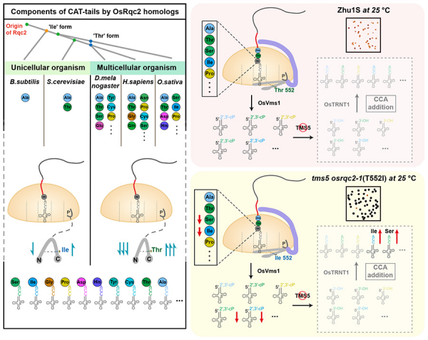 该研究通过EMS诱变筛选获得中高温下可恢复株1S育性的抑制子sot4,将转育起点温度从23℃提升至>25℃。研究通过遗传分析及同源比对发现,SOT4编码的蛋白和酵母中Rqc2p为同源蛋白,并命名为OsRqc2。抑制子sot4(tms5 osrqc2-1)点突变发生在其CC2结构域上,使其第552位Thr突变为Ile。这个位点在不同物种中保守且存有分化,在动植物中为Thr,在真菌中为Ile,在细菌和古菌中为Ile或Leu。遗传实验与体内生化实验证明,OsRqc2参与调控tms5突变体转育起点温度,且T552I突变致使其添加CATylation的速率变慢。