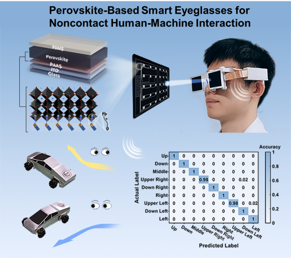 进一步,该研究将高性能钙钛矿光电传感器阵列集成为可穿戴智能眼镜。通过卷积神经网络算法优化,智能眼镜可以实现眼球运动的高精度识别。研究显示,在角度分辨率5°测试条件下,智能眼镜识别准确率达99.86%;对于9种不同指令,智能眼镜识别准确率达99.08%。同时,操控者通过控制眼球轨迹,可在复杂场景中操控模型汽车准确行进,展现出良好的人机交互能力。