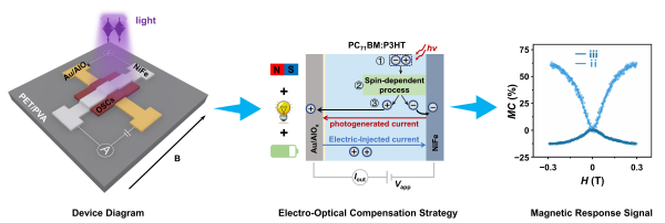 在自旋电子学领域,能够在室温下表现出大范围可调的磁响应信号的器件颇有应用价值。有机半导体具有独特的超长自旋寿命和丰富的光电特性,被认为是研发此类器件的理想候选材料。目前,有机自旋器件受限于有限的设计策略,磁流比通常低于10%,限制了其多功能应用。