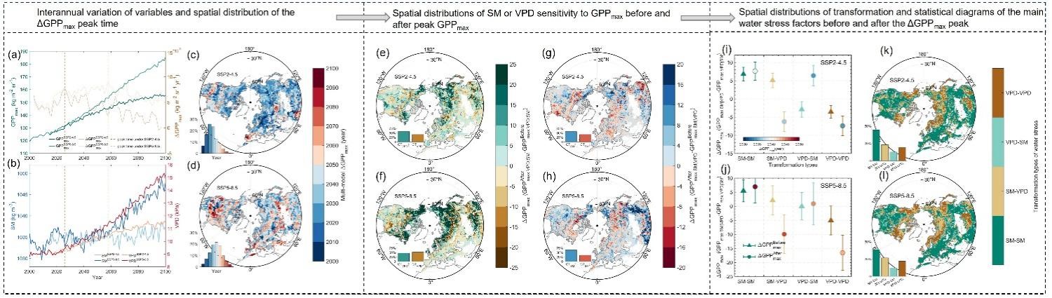 研究认为,北半球植被总初级生产力对大气水分亏缺和土壤水分敏感性的空间模式发生了转变。研究预计,未来超过36%的区域受不同水分主导作用将发生转变,约58.15%(SSP2-4.5情景)和64.37%(SSP5-8.5情景)的区域土壤水分对最大总初级生产力增长速度的影响将会增强。