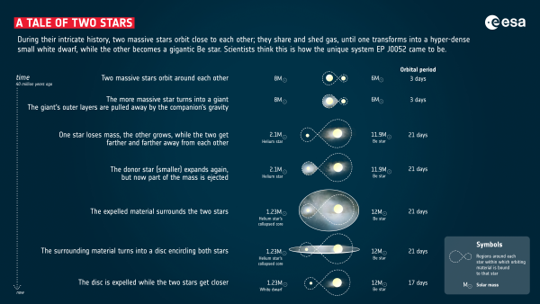 科学家推测,这对双星最初由两颗质量较大的恒星组成,经过复杂的物质交换演化成如今的Be星和白矮星。白矮星通过强大的引力从Be星吸取物质,进而引发这次短暂而明亮的X射线爆发。