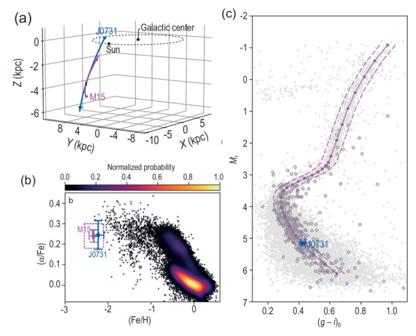 该研究对欧洲航天局盖亚空间探测器和我国郭守敬望远镜发现的近千颗高速星及银河系中百余个球状星团进行轨道回溯,发现一颗高速星J0731+3717在约2000万年前以接近550km/s的超高速度从球状星团M15中弹射而出。同时,J0731+3717有着与M15高度一致的化学丰度和年龄。