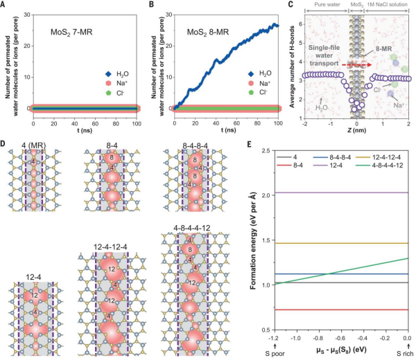 中国科学院青海盐湖研究所、上海大学、华南理工大学、香港大学、沙特阿拉伯阿卜杜拉国王科技大学等,基于前期对界面水合离子相互作用的理解以及对受限空间离子筛分和输运行为的认识,进一步发现通过调控二硫化钼(MoS2)晶界纳米孔缺陷尺寸,可以实现有效水/离子分离和离子精准筛分,达到海水淡化及离子精准提取的效果。